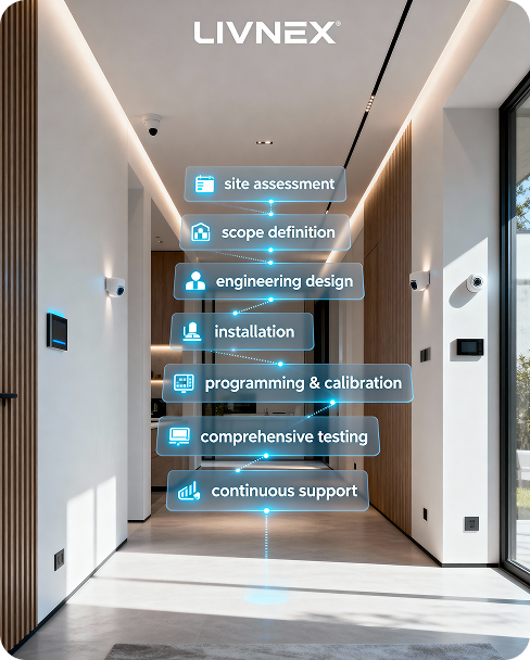 تعتمد ليفنيكس على هندسة دقيقة تدمج التقنية داخل هيكل المكان دون الإخلال بجماليته. فنطوّر بنية ذكية تستجيب لحركة المستخدم، تغيّر الإضاءة، تراقب جودة الهواء، وتعيد توزيع الطاقة بكفاءة. هذه الأنظمة تعمل تلقائيًا وتوفر تجربة استخدام سهلة وموثوقة، مما يجعل المبنى أكثر استقرارًا وذكاءً وملاءمة للحياة اليومية.